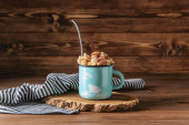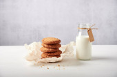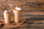 Szklanka mrożonej latte hojicha i ciasteczka na jasnym drewnianym stole