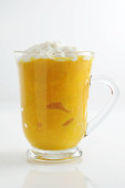 Szklana filiżanka pysznej latte kurkuma i cynamon na białym tle