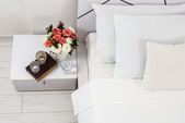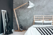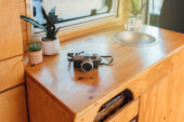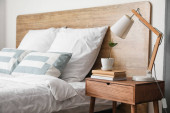 Drewniana szafka nocna z aparatem fotograficznym i wiklinowym koszem w jasnej sypialni