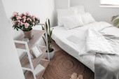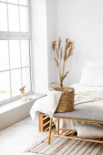 Drewniana szafka nocna z aparatem fotograficznym i wiklinowym koszem w jasnej sypialni
