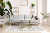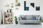 Wnętrze stylowego salonu z szarą sofą, roślinami domowymi i pegboardem