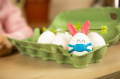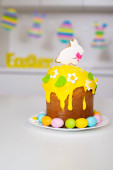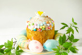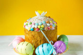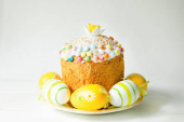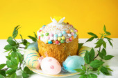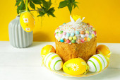 Ciasto wielkanocne z malowanymi jajkami na talerzu w białym stole. Tradycyjne świąteczne jedzenie. Żółte tło