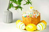 Zdjęcie "Ciasto wielkanocne z malowanymi jajkami na talerzu w białym stole. Tradycyjne świąteczne jedzenie. Żółte tło" może być wykorzystywane do celów osobistych i komercyjnych zgodnie z warunkami zakupionej licencji Royalty-free. Obraz jest dostępny do pobrania w jakości wysokiej rozdzielczości do 5760x3840.