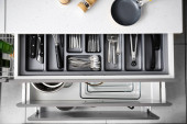 Otwarta szuflada na kuchnię z trzepaczką i sztućcami, zbliżenie