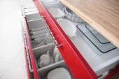 Otwarte szuflady z kompletem naczyń kuchennych w pokoju
