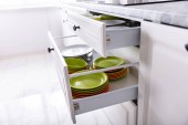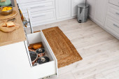 Otwierane szuflady z naczyniami i słoiki z produktami w kuchni