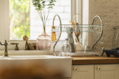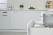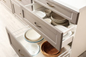 Widok z bliska otwartej szuflady z naczyniami w kuchni
