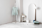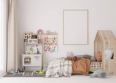 Wnętrze pokoju ze stojącym biurkiem, zabawkami i stylowym dywanem