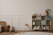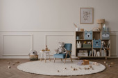 Zdjęcie "Wnętrze pokoju ze stojącym biurkiem, zabawkami i stylowym dywanem" może być wykorzystywane do celów osobistych i komercyjnych zgodnie z warunkami zakupionej licencji Royalty-free. Obraz jest dostępny do pobrania w jakości wysokiej rozdzielczości do 5760x3840.