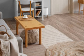 Widok nowoczesnego korytarza ze stylowym dywanem przez okno