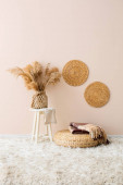 Ławka z pięknymi kwiatami, butami i stylowym dywanem w świetlicy