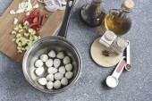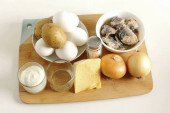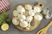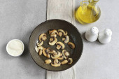 Płukać grzyby, marchewki i cebulę, suche. Następnie pokroić warzywa na małe kawałki.