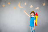 Szczęśliwe dziecko bawiące się zabawkową rakietą w domu. Dzieciak udaje astronautę. Wyobraźnia i koncepcja marzeń dzieci