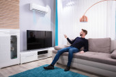 Zdjęcie "Młody człowiek na kanapie działających klimatyzator z pilotem." może być wykorzystywane do celów osobistych i komercyjnych zgodnie z warunkami zakupionej licencji Royalty-free. Obraz jest dostępny do pobrania w jakości wysokiej rozdzielczości do 5760x3840.