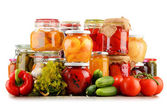 Skład ze słoikami marynowanych warzyw. Żywność marynowana