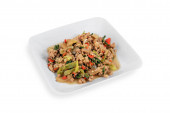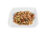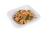 smażony kurczak z imbirem i grzybami na talerzu na białym tle