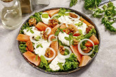 Zdjęcie "Mżywić sałatkę olejem i sosem z granatu, ewentualnie dodać nasiona sezamu, sól i pieprz do smaku." może być wykorzystywane do celów osobistych i komercyjnych zgodnie z warunkami zakupionej licencji Royalty-free. Obraz jest dostępny do pobrania w jakości wysokiej rozdzielczości do 5760x3840.
