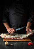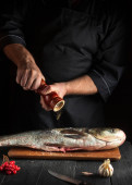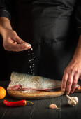 Kucharz przygotowuje srebrne śledzie karpia w kuchni. Szef kuchni posypuje rybę solą. Środowisko pracy na stole kuchennym.