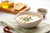 Dip hummus z ciecierzycy i pietruszki w ceramicznej misce na powierzchni marmuru z tosty plasterki bagietki i oliwy z oliwek na desce drewnianej