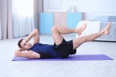 Silny, zdrowy mężczyzna z mięśniami, trenujący w domu. Sprawność w domu. Joga.