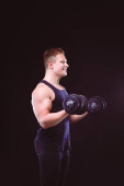 Silny, zdrowy mężczyzna z mięśniami, trenujący w domu ze sztangą. Sprawność w domu