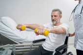 Mężczyzna pracownik medyczny wspierający nogi emeryta podczas ćwiczeń