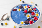 Zdjęcie "Miska smoothie z mrożonymi jagodami i kwiatami na białym tle. Bardzo Peri kolor roku 2022. widok z góry. zdrowe śniadanie" może być wykorzystywane do celów osobistych i komercyjnych zgodnie z warunkami zakupionej licencji Royalty-free. Obraz jest dostępny do pobrania w jakości wysokiej rozdzielczości do 5760x3840.