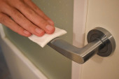 Uchwyty do drzwi czyszczących z mokrą chusteczką antyseptyczną i rękawiczkami. Sanityzacja profilaktyki powierzchni w szpitalach i przestrzeniach publicznych przed wirusem korony. Ręka kobiety za pomocą ręcznika do sprzątania drzwi domu link