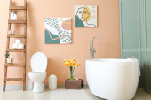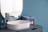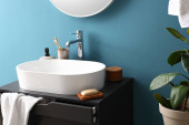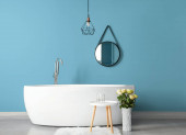 Zdjęcie "Stół z umywalką i wanną w pobliżu niebieskiej ściany" może być wykorzystywane do celów osobistych i komercyjnych zgodnie z warunkami zakupionej licencji Royalty-free. Obraz jest dostępny do pobrania w jakości wysokiej rozdzielczości do 5760x3840.