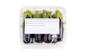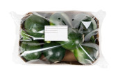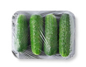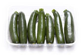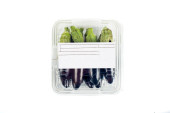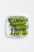 Świeżo zebrany miniogórek z opakowaniem i etykietą na białym tle