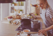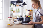Młoda kobieta używa tabletu do gotowania w kuchni
