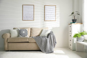 Zdjęcie "Stylowe pufy z dzianin i sofa w salonie. Projektowanie domu" może być wykorzystywane do celów osobistych i komercyjnych zgodnie z warunkami zakupionej licencji Royalty-free. Obraz jest dostępny do pobrania w jakości wysokiej rozdzielczości do 5760x3840.