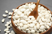 Surowa biała fasola i łyżka w misce na stole, zbliżenie