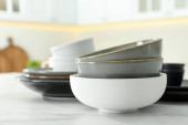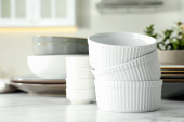 Zdjęcie "Zestaw naczyń do jedzenia, balonowa trzepaczka i miski na szarym stole w kuchni. Miejsce na tekst" może być wykorzystywane do celów osobistych i komercyjnych zgodnie z warunkami zakupionej licencji Royalty-free. Obraz jest dostępny do pobrania w jakości wysokiej rozdzielczości do 5760x3840.