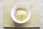 Szlifować paluszki krabowe w szlifierce lub przejść przez maszynę do mielenia mięsa. Przeniesienie do miski.