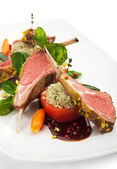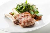 Pieczony stek wieprzowy z warzywami i sosem. Kotlety wieprzowe z żeberkami. danie główne wieprzowiny w stylu rustykalnym