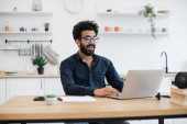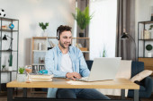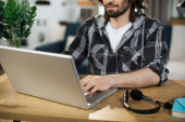 Mężczyzna siedzi w domu i pisze na laptopie bezprzewodowym