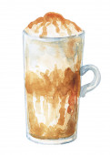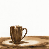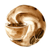 Streszczenie brązowa planeta kawy z filiżanką, oparów i fasoli wokół niego dla projektu. Ręcznie rysowana kawa na papierowej fakturze. Obraz rastrowej mapy bitowej. Kolekcja kawy