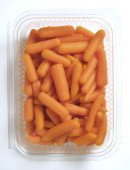 Nowe zbiory oczyszczone marchewki pakowane i etykietowane na białym tle
