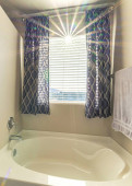 Wnętrze kwadratowej łazienki z białymi ścianami i zabytkowym wyposażeniem