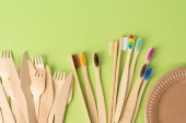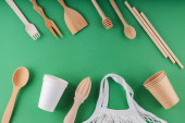 biała bawełniana torba, papierowe kubki i drewniane szczoteczki do zębów na zielonym tle. Odpady nadające się do recyklingu, widok z góry