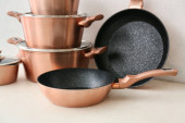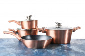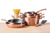 Zestaw miedzianych naczyń kuchennych na beżowym stole na białym tle
