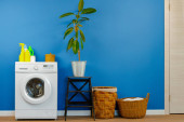 Wnętrze pralni z nowoczesną pralką w pobliżu ściany z żółtej cegły