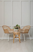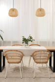 Jadalnia wnętrze z drewnianym stołem i krzesłami wiklinowymi