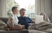 Zdjęcie "Pozytywny mężczyzna trzyma smartfona w pobliżu syna z laptopem w salonie " może być wykorzystywane do celów osobistych i komercyjnych zgodnie z warunkami zakupionej licencji Royalty-free. Obraz jest dostępny do pobrania w jakości wysokiej rozdzielczości do 5760x3840.