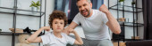 Pozytywny rodzic i nastolatek syn biorąc selfie na smartfonie w domu, baner