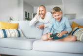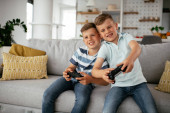 Zdjęcie "KYIV, UKRAINE - PAŹDZIERNIK 11, 2021: Uśmiechnięty mężczyzna trzymający joysticka i patrzący na syna na kanapie w domu " może być wykorzystywane do celów osobistych i komercyjnych zgodnie z warunkami zakupionej licencji Royalty-free. Obraz jest dostępny do pobrania w jakości wysokiej rozdzielczości do 5760x3840.