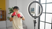 Nastoletnie dziecko w rękawiczkach boks obok taty z pad w domu, sztandar