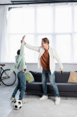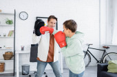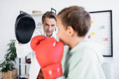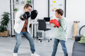 Uśmiechnięty chłopak boks z tatą w poduszkach w domu