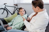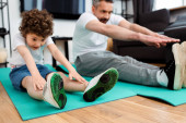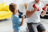 Uśmiechnięty chłopak boks z tatą w podkładkach bokserskich w domu